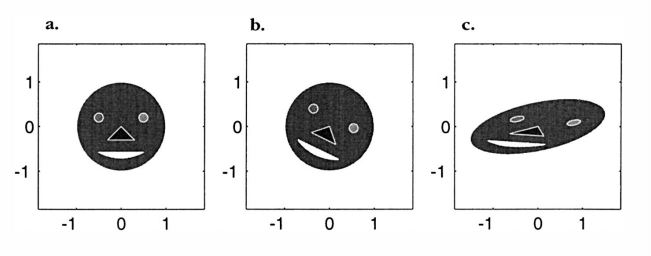 b그림에서 $W$ 선형변환을 살펴보면 $\cos \theta = \frac{2}{\sqrt{5}}, \, \sin \theta = \frac{1}{\sqrt{5}}$인 $\theta$각 만큼의 회전 변환임을 알 수 있다. c그림에서 $R$ 선형변환을 살펴보면 $D$의 고윳값들은 회전한 $x$축 방향으로 얼마만큼 늘리거나 줄였는지 나타내는 값으로 길이 변환임을 알 수 있다.