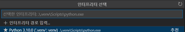 - 파이썬 인터프리터를 가상환경의 인터프리터로 설정해야 된다.